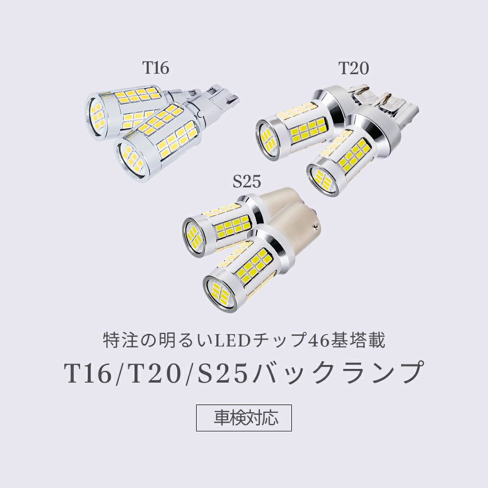 LEDバックランプ 爆光6500Kホワイト 特注LEDチップ46基搭載でヘッドライト級明るさ11080lx、省エネ&車検対応2年保証付き T16 T20 S25規格 バルブ