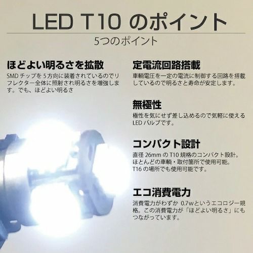 SMD 5連 LEDバルブ ポジション/ナンバープレート/ドア下ランプ用、4300K/6000K/8000K、省エネ・無極性、車検対応・2年保証、1セット2個 T10