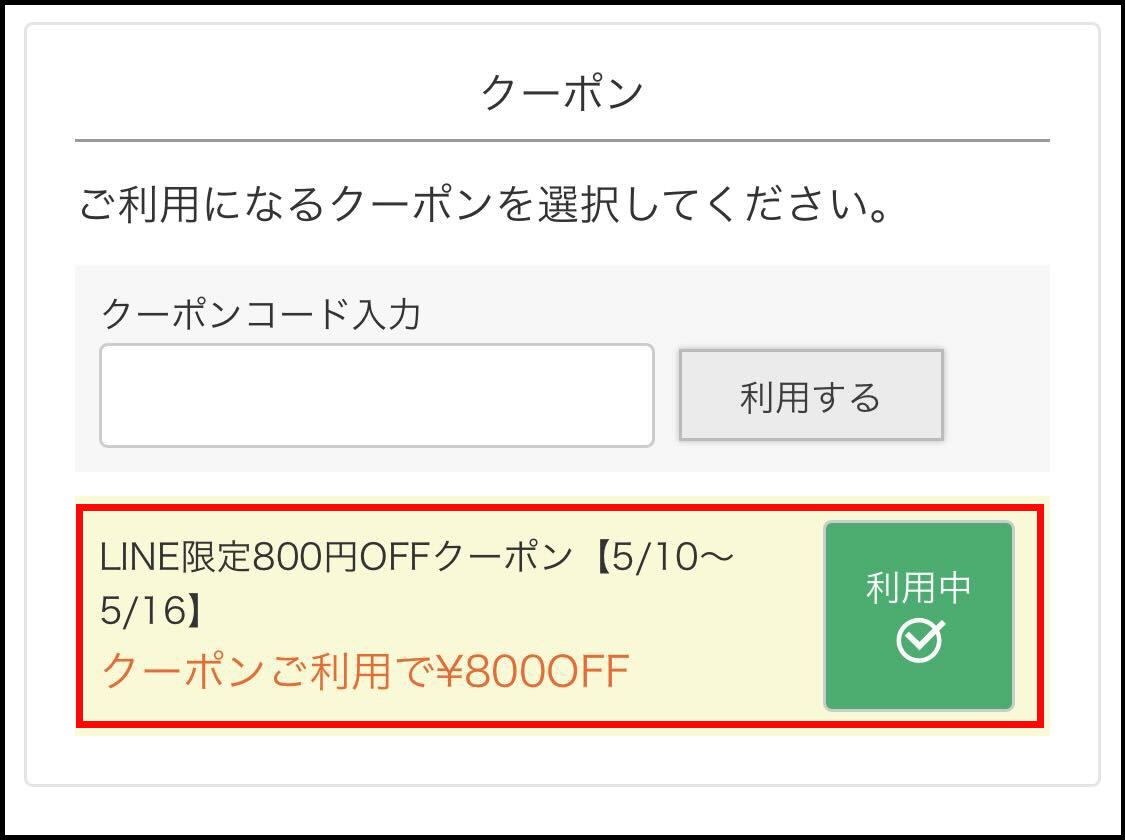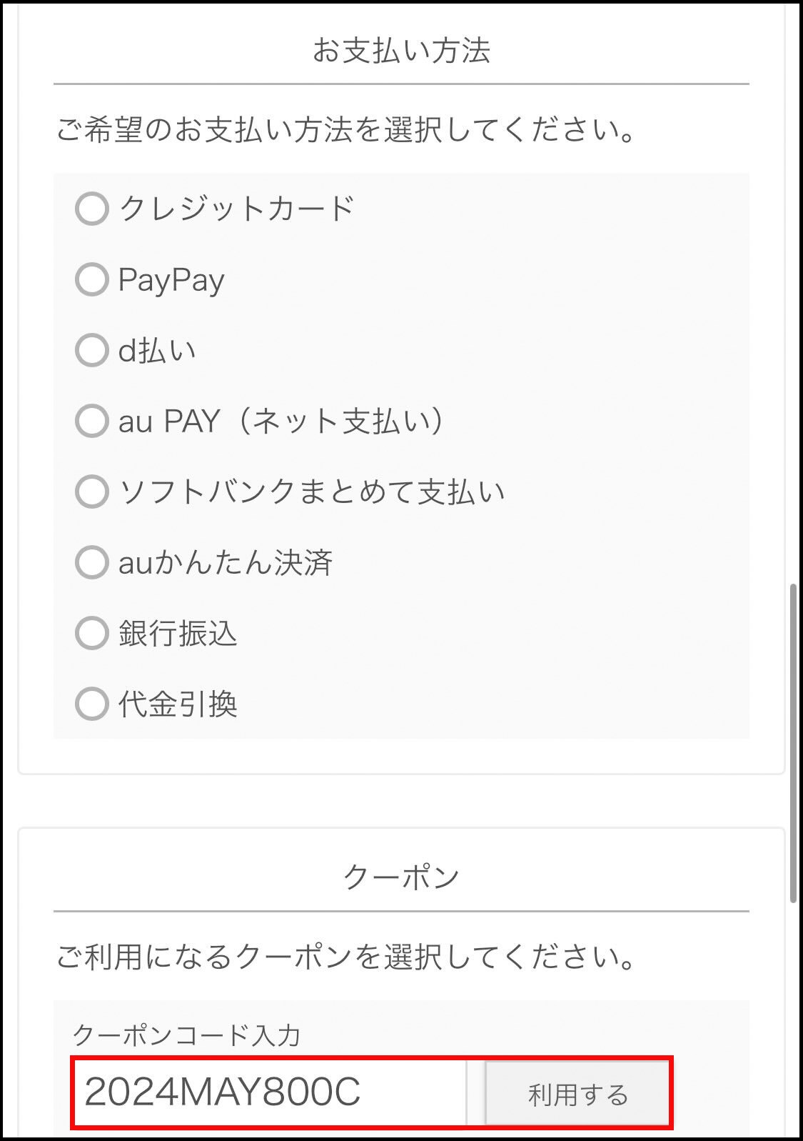 ご注文手続き画面下部付近にある「クーポン」からクーポンコードを入力して、「利用する」ボタンを押してください。