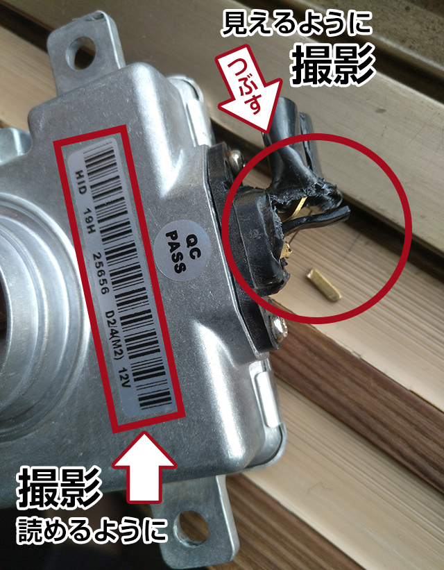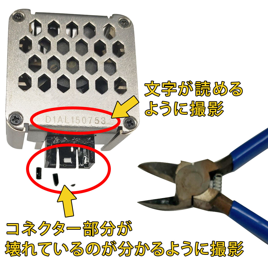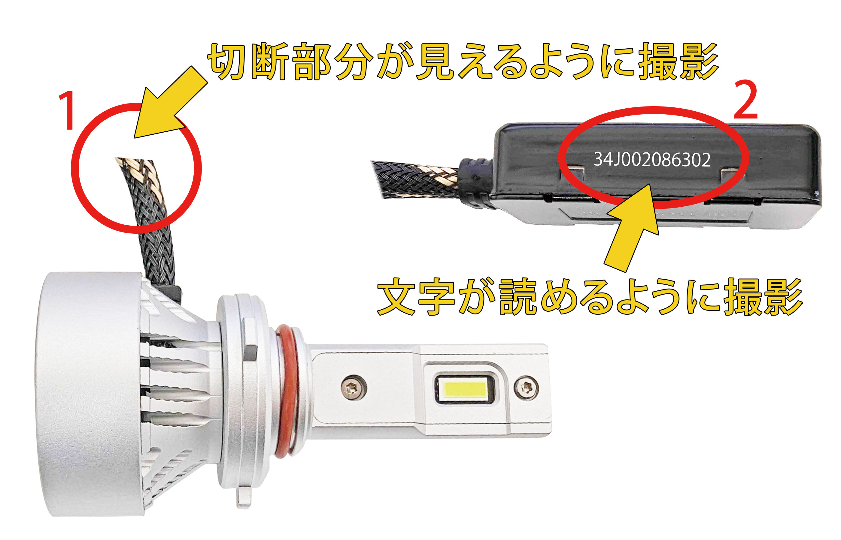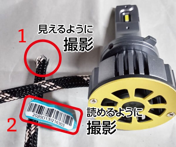 円滑な返品交換のため、以下のポイントを抑えた撮影をお願いします。交換には事前に、断線などの破壊処理が必要となります。